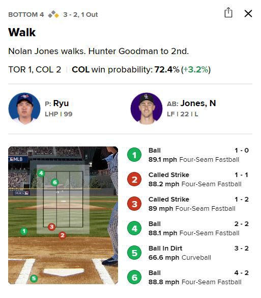 이날 찰리 블랙먼(우익수)-에제키엘 토바(유격수)-엘리아스 디아스(포수)-라이언 맥맨(3루수)-브랜든 로저스(2루수)-헌터 굿맨(지명타자)-놀란 존스(좌익수)-엘로리스 몬테로(1루수)-브렌튼 도일(중견수)으로 구성된 콜로라도 타선을 상대한 류현진. 해발 1600m에 위치한 ‘투수들의 무덤’ 쿠어스필드에서도 5이닝 4피안타(1피홈런) 2볼넷 3탈삼진 2실점 해 팀의 13-9 승리에 발판을 만들었다.
