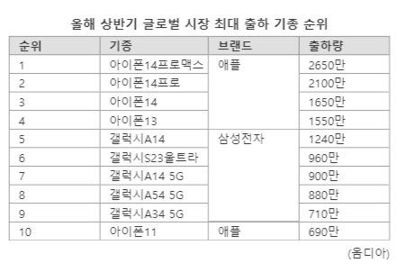 하반기 전반적인 스마트폰 시장은 애플이 주도할 가능성이 높다. 지금까지 지표에서도 아이폰이 공개되는 9~10월을 기점으로 애플의 출하량 및 판매량이 빠르게 증가해왔다. 다음해 상반기까지도 영향을 끼치는 정도다. 옴디아에 따르면 올해 상반기 가장 많이 출하된 스마트폰 기종 10개 중 1~4위 모두 아이폰, 특히 1~3위가 지난해 출시된 아이폰14 시리즈였다.