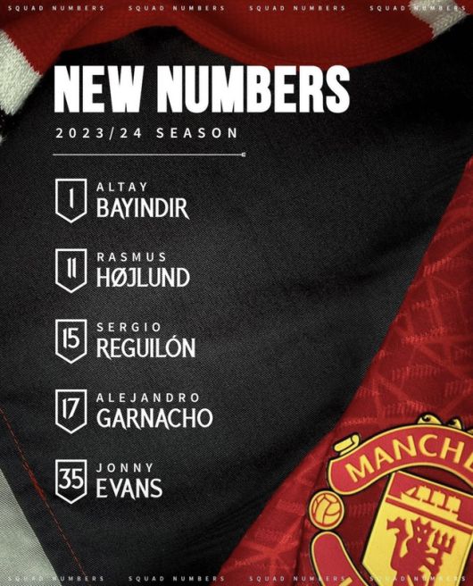 알레한드로 가르나초의 등번호도 변경됐다. 지난 시즌까지 등번호 49번을 달고 뛰었던 가르나초는 프레드가 떠나며 빈 17번으로 옮겼다. 이는 과거 나니, 앤디 콜, 헨리크 라르손 등이 거쳐간 번호다. 추가로 새롭게 영입한 알타이 베인더 골키퍼는 등번호 1번을 착용한다.