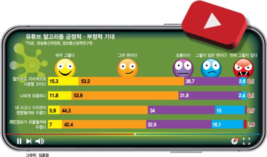 반면 유튜브 알고리즘 추천 서비스에 대한 부정적 인식도 긍정적 기대 못지않았다. 이용자의 과반(50.2%)은 '이용하다 보면 내 사고나 가치관이 편향될까 봐 두렵다'고 답했고, '개인정보가 유출될까 봐 두렵다'(49.4%), '나도 모르게 불법 정보를 받게 될까 봐 두렵다'(47.7%)는 의견도 절반에 가까웠다.