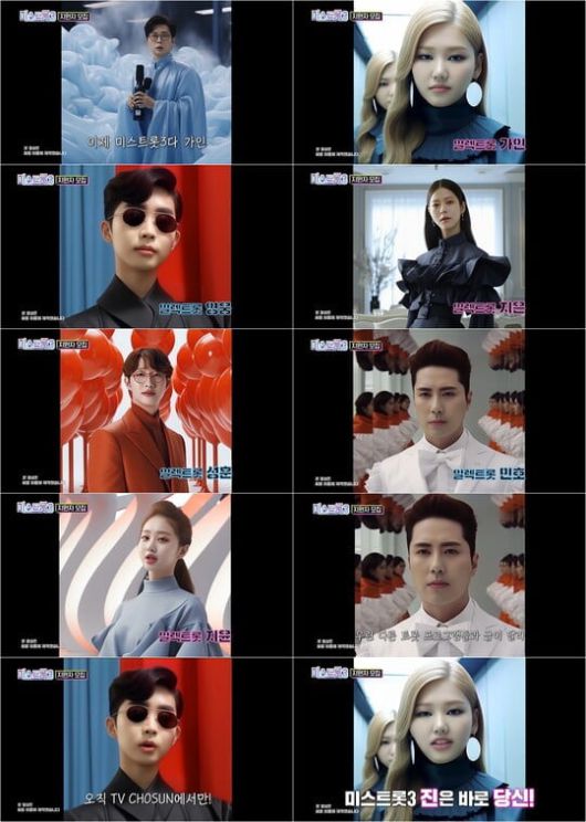 TV CHOSUN '미스트롯3'가 출범을 앞둔 가운데 '미스트롯', '미스터트롯' 주역들이 A.I로 대거 변신한 티저가 공개됐다.