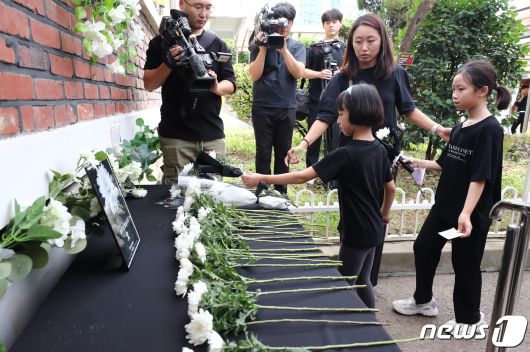 서울 서이초 사망 교사의 49재인 4일 서울 서초구 서이초등학교에 마련된 추모공간을 찾은 학생들이 헌화하고 있다. 2023.9.4/뉴스1 ⓒ News1 유승관 기자 |