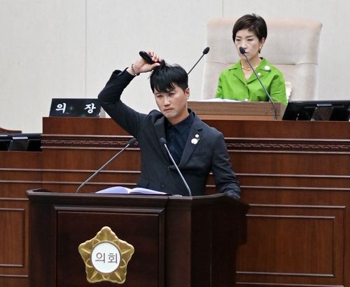 (원주=연합뉴스) 이재현 기자 = 원주 아카데미극장 철거 예산안에 반발해 5분 자유 발언 중 삭발한 더불어민주당 김혁성 원주시의원에 대한 징계가 4일 확정됐다.