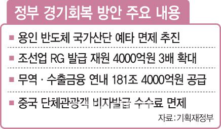 [이데일리 김형욱 김명상 기자] 정부가 반도체 경쟁력을 강화하기 위해 ‘용인 반도체 국가산단’의 예비타당성 조사(예타) 면제를 추진하기로 했다. 조선업의 수주 확대를 위해 선수금 환급 보증(RG) 발급을 확대하고, 중국인의 방한 관광 활성화를 위해 연말까지 중국인 관광객 비자 수수료도 면제한다. 중국발 경기 침체 우려 등으로 하반기 경기 전망에 먹구름이 드리운 가운데 수출 회복과 내수 진작에 범부처 정책역량을 집중해 ‘상저하고’(上低下高) 전망을 현실화하려는 조치로 풀이된다.
