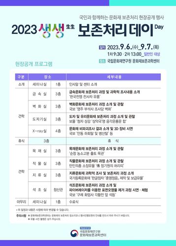 올해로 9년째를 맞는 '생생生生 보존처리 데이Day'는 손상된 문화유산의 재질별 보존처리 과정을 국민에게 알리고, 참여하는 학생들이 직접 보존과학자가 돼보는 간접경험을 통해 향후 진로나 직업선택에도 도움이 될 수 있도록 마련된 체험 행사이다.