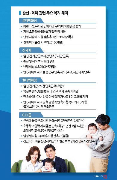 앞서 롯데백화점을 비롯한 유통업체 대부분은 남성 의무 육아 휴직제를 시행하는 등 육아 지원을 위한 복지제도를 운영해왔다. 다만 저출산 극복을 위한 제도는 상대적으로 미미했다는 얘기가 나왔다. 실제로 롯데백화점을 제외한 다른 유통업체의 복지제도를 살펴보면 저출산 극복에 초점을 맞춘 복지제도는 합계출산율이 1명 미만으로 떨어진 현 상황을 제대로 반영했다고 보긴 어렵다.