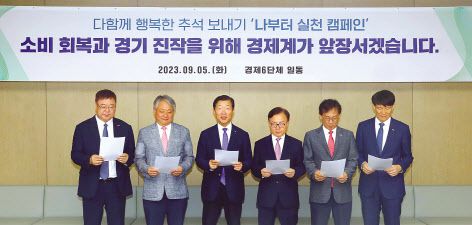 대한상공회의소, 전국경제인연합회, 한국경영자총협회, 한국무역협회, 중소기업중앙회, 중견기업연합회 등 경제 6단체는 5일 서울 대한상의 회관에서 경기 진작을 위해 ‘추석맞이 공동 캠페인’을 진행했다.