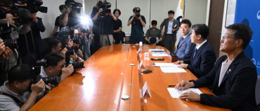 이주호(가운데) 부총리 겸 교육부 장관이 5일 정부서울청사에서 열린 '부총리-교원단체 간담회'에서 발언하고 있다. 이날 간담회에는 공교육을 정상화 방안 및 학교 현장의 안정을 위한 방안을 논의하기 위해 마련됐다. 정성국(왼쪽부터) 한국교원단체총연합회장, 이 부총리, 김용서 교사노조연맹위원장. 오승현 기자 2023.09.05