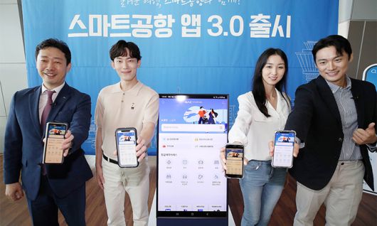 윤형중 한국공항공사 사장(맨 왼쪽)과 방송인 오상진(맨 오른쪽)이 5일 서울 강서구 김포공항 국내선 나래마루에서 열린 ‘스마트공항 앱 3.0’ 출시 행사에서 앱을 소개하고 있다. 뉴스1 |