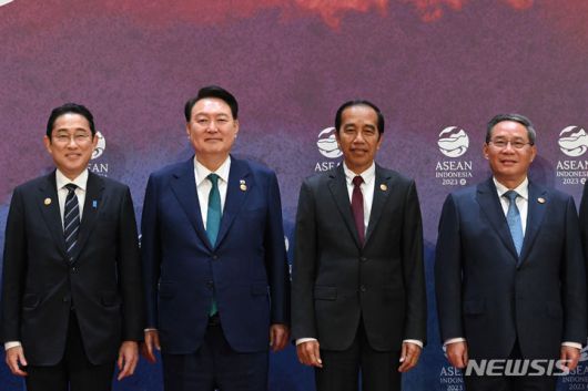 [자카르타=뉴시스] 전신 기자 = 중국의 리창(李强) 총리와 기시다 후미오(岸田文雄) 일본 총리와 6일 오후 인도네시아 자카르타에서 동남아시아국가연합(아세안·ASEAN) 정상회의를 계기로 접촉했다고 일본 언론들이 보도했다. 사진은 윤석열 대통령이 6일(현지시간) 자카르타 컨벤션센터(JCC)에서 열린 아세안+3 정상회의에서 기시다 후미오 일본 총리, 리창 중국 총리, 조코 위도도 인도네시아 대통령과 기념촬영하고 있다는 모습(공동취재) 2023.09.06. photo1006@newsis.com |