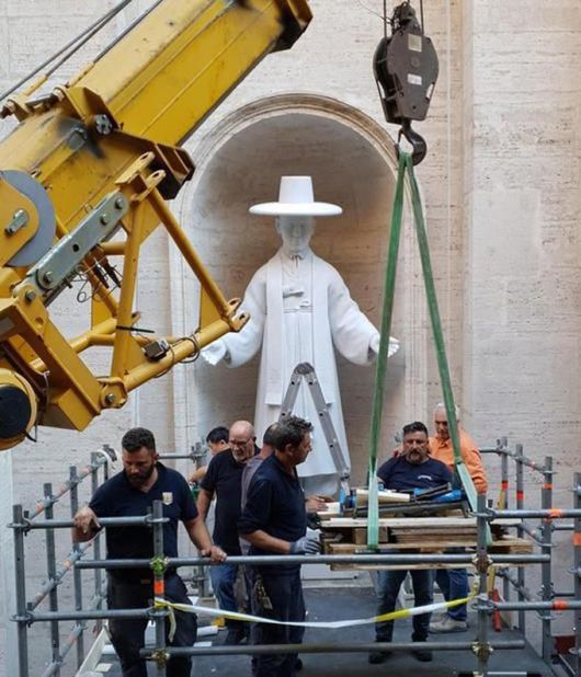 한국인 최초 가톨릭 사제 성 김대건 안드레아 신부의 조각상이 5일(현지시간) 바티칸 성베드로 대성당에 세워지고 있다. 한국천주교주교회의 제공 |