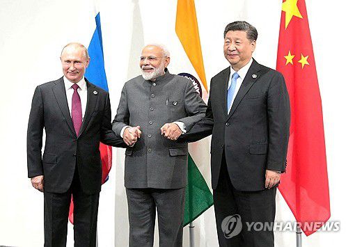손잡는 푸틴 러시아 대통령과 모디 인도 총리, 시진핑 중국 국가주석 |