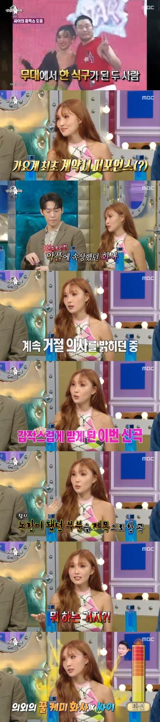 이날 방송에서 유세윤은 화사의 등장에 "싸이 씨와 손을 잡았다. 계약서 도장을 특이한 곳에서 찍었다고?"라고 물었고, 화사는 "제가 성격이 느린 편이다. 싸이 오빠의 '흠뻑쇼' 게스트로 나갔는데, 그때까지 계약서 도장을 못 찍었었다"고 회상했다.