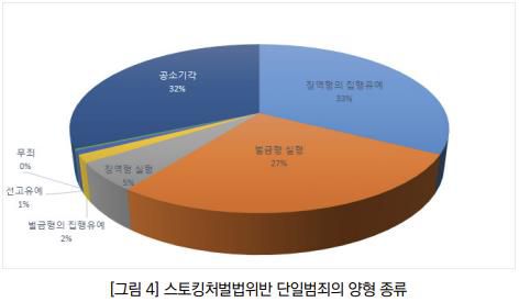 스토킹 처벌법 위반 단일 범죄로 기소돼 확정된 사건 385건 양형을 분석한 결과 징역형의 집행유예가 126건(33%)으로 가장 많았다.