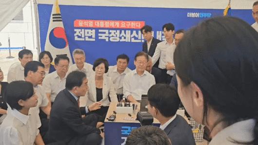 태 의원은 농성장에 들어서자 “대표님께서 단식해 보고 받았는지 모르겠는데”라고 말하자 이재명 대표는 손을 들어 “짧게”라고 응대했다. 태 의원은 이어 “민주당 의원들이 제게 ‘북한에서 온 쓰레기’ 같은 막말을 했다”며 “어떻게 이런 말을 본회의장에서 할 수 있나”라고 목소리를 높였다.