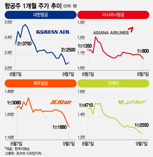제주항공, 진에어, 아시아나항공도 각각 2.7%, 1.26%, 1.73% 떨어졌다. 이날 대한항공은 0.45% 상승했으나 최근 한 달간 항공 주들의 하락세는 이어지고 있다.