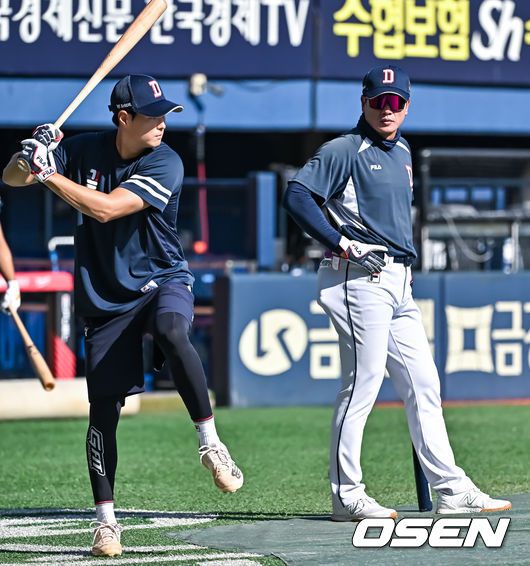 [OSEN=잠실, 박준형 기자] 7일 오후 서울 잠실야구장에서 ‘2023 신한은행 SOL KBO리그’ 두산 베어스와 KIA 타이거즈의 경기가 열린다. 경기 앞서 두산 김주찬 코치가 이날 3번 타자로 선발출전하는 김지훈을 바라보고 있다. 2023.09.07 / soul1014@osen.co.kr