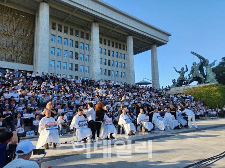 7일 오후 국회 본청 앞 계단에는 이재명 대표와 박광온 원내대표, 한병도 전북도당 위원장과 주요 당직자들, 전북도 지역구 의원들이 모였다. 민주당 추산 2000여명으로 이들은 정부의 새만금 사회간접자본(SOC) 예산 삭감에 항의했다.