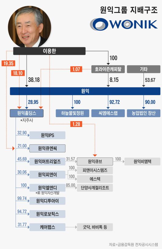 지주사 체제에서는 통상 지주사가 지배구조의 정점에 있지만, 원익홀딩스는 위에 또다른 지배기업이 있다. 6월 말 기준 원익홀딩스의 최대주주는 지분 28.96%를 보유한 원익이다. 원익의 최대주주는 지분 38.18%을 보유한 이 회장이다. 호라이즌캐피탈도 8.15%의 지분을 갖고 있다. 호라이즌캐피탈은 자본금 22억원으로 설립된 자산평가 회사다. 이 회장이 지분 전체를 가지고 있다. 이를 합치면 이 회장 지분은 46%가 넘는다.
