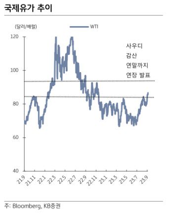 오재영 KB증권 연구원은 8일 보고서에서 “9월 5일 사우디아라비아와 러시아가 연말까지 각각 일일 100만배럴, 30만배럴씩 감산을 연장하겠다고 밝히면서 유가가 서부텍사스산원유(WTI) 기준 7월 70달러에서 현재 89달러까지 27% 상승했다”고 밝혔다. 그로 인해 연말까지 국제유가는 상방 압력이 우세할 것이라고 내다봤다.