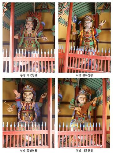 사천왕상은 절(寺) 입구 천왕문에 봉안돼 사찰과 대중을 지키는 역할을 하는 호법신이다. 각 방향에 따라 동쪽은 지국천왕, 서쪽은 광목천왕, 남쪽은 증장천왕, 북쪽은 다문천왕으로 불리며, 각각 보검, 보당(깃발 달린 창), 용과 여의주, 비파 등을 손에 잡고 있다. 또 부릅뜬 눈, 크게 벌어진 입과 꼭 다문 입술, 갑옷을 입고 있는 신체, 발아래에는 악귀 등의 생령좌를 밟고 있는 모습으로 표현돼 있다.