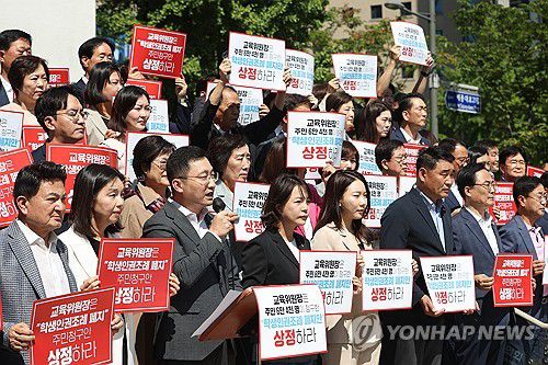 국힘 소속 시의원 76명은 이날 본회의에 앞서 피켓 시위를 하고 '학생인권조례 폐지조례안'을 상임위 회의에 상정하지 않고 보류 중인 민주당 소속 이승미 교육위원장을 규탄했다.