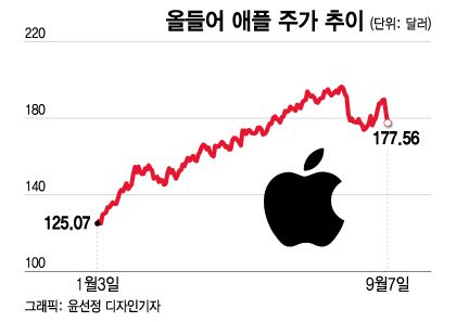 애플은 7일 177.56달러로 마감해 지난 7월31일에 기록했던 고점 196.45달러에 비해 9.6% 하락한 상태다.