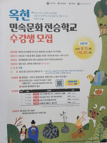 강좌는 '민속문화전승학교'라는 명칭으로 11월 3일부터 매주 금요일 오후 2시 옥천통합복지센터에서 무료 운영된다.
