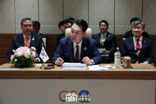 [서울=뉴스핌]윤석열 대통령이 9일(현지시간) 뉴델리 바라트 만다팜 국제컨벤션센터에서 열린 G20 정상회의 '하나의 지구(One Earth)' 세션에 참석해 있다.[사진=대통령실] 2023.09.09 photo@newspim.com |