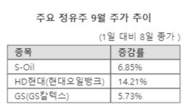 정유주가 일제히 우상향 곡선을 그린 것은 지난달 말 국제유가가 상승하기 시작한 이후다. 지난 7일(현지시간) 뉴욕상업거래소에 따르면 10월 인도분 서부텍사스산원유(WTI) 선물가격은 86.87달러에 거래를 마쳤다.