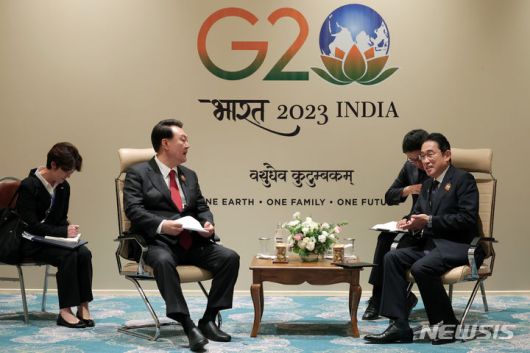 [뉴델리=뉴시스] 박미영 기자 = 윤석열 대통령은 10일(현지시간) 뉴델리G20(주요20개국) 정상회의 계기의 한일 정상회담을 갖고 한일중 정상회의 개최를 촉구했다.