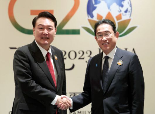 주요 20개국(G20) 정상회의에 참석 중인 윤석열 대통령이 10일(현지시각) 인도 뉴델리 바라트 만다팜 국제컨벤션센터에서 열린 한-일 정상회담에서 기시다 후미오 일본 총리와 악수하고 있다. 연합뉴스 |
