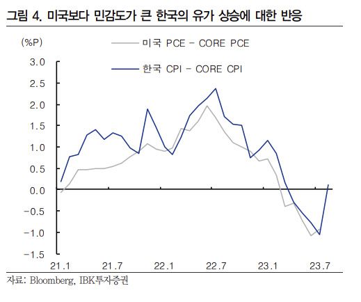 유가 상승은 미국과 한국 모두 물가 하방 경직성 요인으로 작용하지만 한국은 원유 수입국인 만큼 수출국인 미국 대비 유가 변동 민감도가 더 높다는 점을 주목했다.