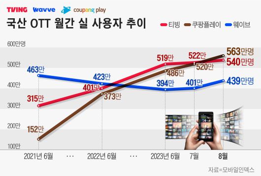 쿠팡플레이의 성장세는 가파르다. 쿠팡플레이의 MAU는 지난 2021년 6월만 해도 152만명에 불과했다. 그러나 1년 후인 2022년 6월 373만명으로 두 배 이상 급증하더니 올해 6월 486만명, 7월 520만명, 8월 563만명으로 증가세를 이어가고 있다. 쿠팡플레이가 지난 2020년 12월 서비스를 시작한 OTT 후발주자인 점을 고려하면 빠르게 세를 확장하고 있는 것이다.