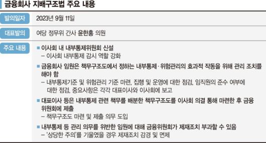 법안 발의자와 시기도 주목할 지점이다. 금융위원회는 지난 6월 이 같은 내용의 내부통제 개선방안을 발표했지만 두 달 넘게 입법화가 안 됐었다.