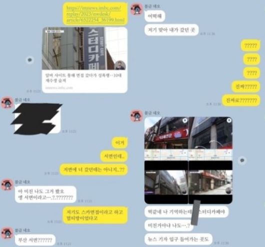 대화에서 A 씨가 뉴스 링크를 보내며 "이거 서면인데 저번에 너 갔던 데 아니냐. 저기도 스터디카페 면접이라고 하고 멀티방이었다고 하더라. 영상에 모자이크돼 있긴 한데 너 갔던 데 위치랑 비슷한 것 같더라"고 말하자, B 씨는 영상을 확인한 후 "어떡해. 저기 맞아. 내가 갔던 곳"이라고 말했다.