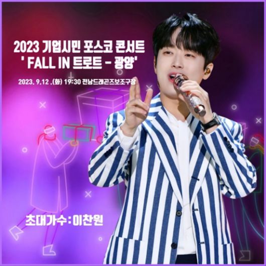이찬원은 12일 오후 7시 30분 전남 광양시 전남 드레곤즈 보조구장에서 열리는 '2023 기업시민 포스코 콘서트 FALL IN 트로트'에 출연해 무대를 펼친다.