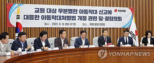 (서울=연합뉴스) 김연정 김철선 기자 = 국민의힘과 정부는 12일 교원에 대한 아동학대 혐의 수사나 조사 시 수사기관이나 지방자치단체가 해당 교원이 소속된 교육지원청 교육감 의견을 의무적으로 듣도록 법 개정을 추진하기로 했다.
