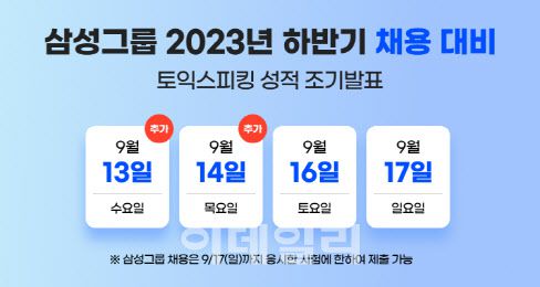 삼성그룹 원서 접수 기간은 11일부터 18일까지이며, 세부 일정은 그룹사별로 상이하다. 14일 시행되는 토익스피킹 성적은 16일 12시, 16일, 17일 시행되는 토익스피킹 성적은 18일 12시, 14시에 각각 발표된다.