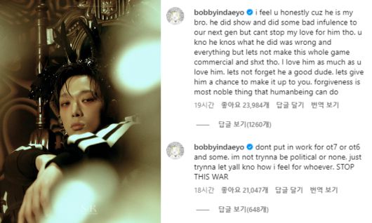 그러면서 바비는 "이 발언은 7인 멤버 지지나 6인 멤버 지지에 관한 게 아니다"라며 "정치적으로 이용하려는 것도 아니다. 그냥 팬들을 이해한다는 뜻이니 논쟁을 멈춰달라"라고 호소했습니다.