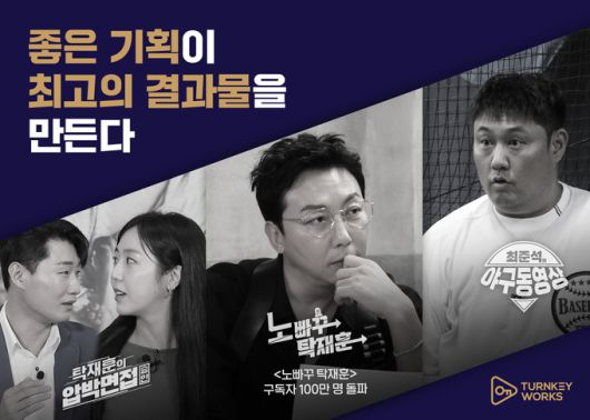 구독자 100만 명, 누적 조회수 1억 2천만 뷰를 돌파한 유튜브 컨텐츠 ‘노빠꾸 탁재훈’, 업로드 1일차만에 100만뷰를 돌파한 ‘탁재훈의 압박면접’, 그리고 야구팬들을 욕망을 노리는 ‘최준석의 야구동영상’ 까지. 최근 유튜브를 뜨겁게 달구고 있는 이 모든 콘텐츠들이 주식회사 턴키웍스에서 기획 제작 운영 중에 있다.