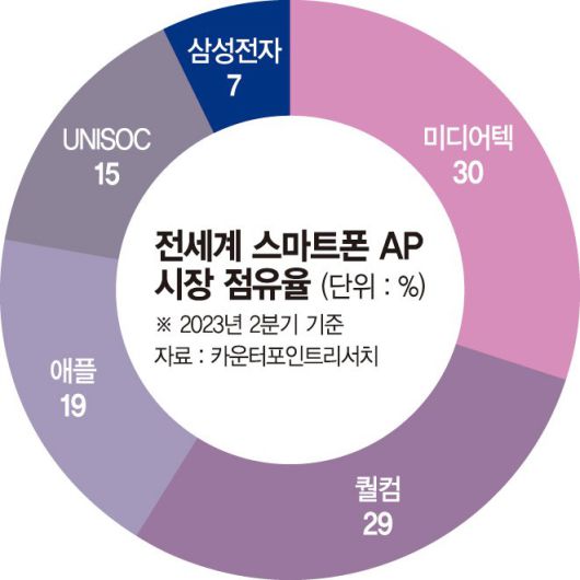 일단 점유율은 종전 수준으로 회복했지만 선두업체들과의 격차는 여전히 크다. 대만 미디어텍은 '디멘시티' 시리즈를 앞세워 30% 점유율로 1위를 유지했고 퀄컴(29%), 애플(19%), UNISOC(15%)은 2~4위를 나타냈다. 삼성전자와 점유율 격차가 적게는 8%p, 많게는 23%p까지 벌어졌다.