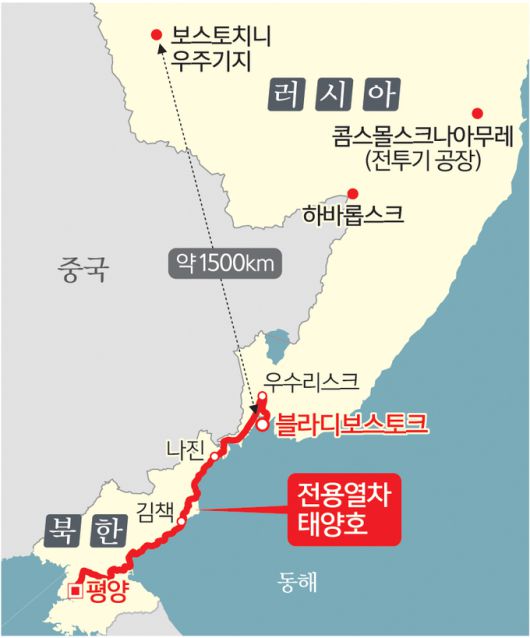 이날 북한 관영매체 조선중앙통신과 노동당 기관지 노동신문은 김 위원장 및 방러 수행단 출발 소식과 함께 사진을 다수 게재했다. 러시아행 열차에 오르는 김 위원장을 뒤따르는 인물로 군 서열 1위 리병철 당 비서와 군 실세로 부활한 박정천 군정지도부장, 김명식 해군사령관, 김정관 국방성 제1부상이 모습을 드러냈다. 포탄 등 재래색 무기 생산과 관련 있는 조춘룡 군수공업부장도 보였다. 한·미 해상훈련에 맞서기 위한 대응책이 논의될 것으로 추정되는 대목이다.