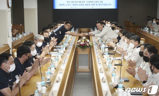 21일 오후 현대자동차 울산공장 본관 동행룸에서 열린 현대차 노사의 2022년 임금협상 조인식에서 이동석 현대차 대표이사와 안현호 현대차지부장이 악수를 하고 있다. 2022.7.21/뉴스1 ⓒ News1 윤일지 기자 |
