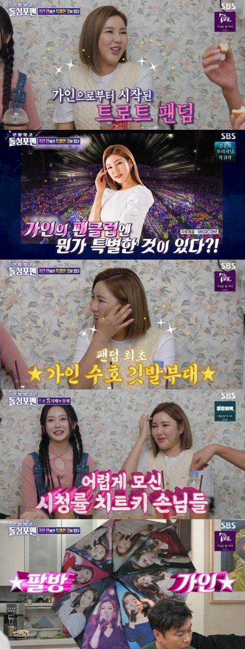 이어 “송가인이 시작한 또 하나의 문화가 있다. 트로트 팬덤이다”이라고 밝혀 관심을 모았다. 이상민은 “팬클럽이 최초인 게 많다. 깃발을 든 퍼포먼스”라고 언급했고, 이에 송가인은 “깃발 부대가 딱 있다”라며 대형 깃발임을 강조했다.
