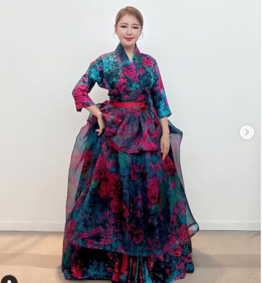 사진 속 송가인은 화려한 한복을 입고 우아한 자태를 드러낸다. 송가인은 늘씬한 몸매로 단아하게 소화하고 있다.