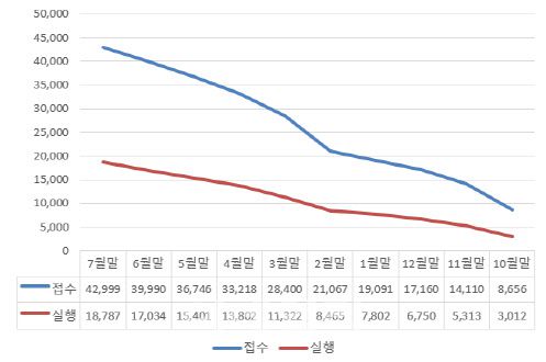 신보 관계자는 대환 프로그램의 집행률이 낮은 것에 대해 “접수만 하고 취소하거나 부적격 대상으로 분류되 승인이 되지 않는 경우 등 다양하다”며 “단순 접수 후 취소건이 많이 포함돼 있다”고 말했다.