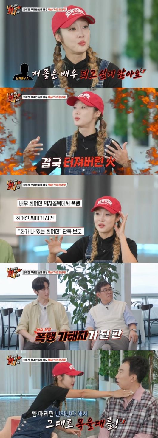 거기서 끝이 아니었다. 최여진은 "여기서는 멱살 안 잡았다. 욕을 했다. 그럼 스태프들이 다음부터 둘이 멜로찍어야되는데 눈치보게 되지 않나. 제가 민폐끼친거 아니냐. '죄송하다, 제가 화를 못참았다'고 사과를 드리고 제가 잘 달래서 걔랑 밖에 나갔다. '누나가 미안하다. 속상한거 있으면 풀고 내일부터 우리 촬영 잘해야되는데 잘해보자' 했더니 담배를 피우더니 얼굴에다가 연기를 부는거다"라고 밝혀 모두를 경악케 했다.