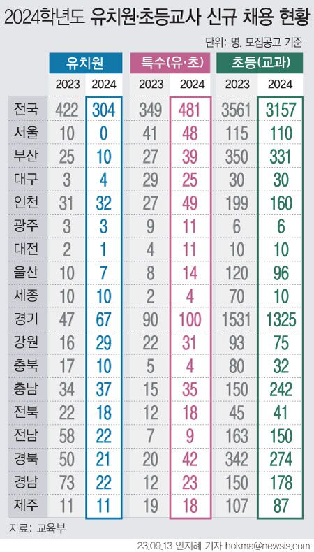 시도교육청별 공립 유·초·특수 신규교사 선발인원 모집공고 현황(그래픽=뉴시스) |