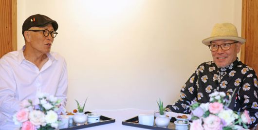 [서울=뉴시스] '고독한 미식가'의 쿠스미 마사유키 작가와 '식객'의 허영만 작가가 13일 서울 종로구에 위치한 한 한식당에서 만나 음식을 통한 한·일 문화관광 교류 활성화를 위한 아이디어를 나누고 있다. (사진=문화체육관광부 제공) 2023.09.13. photo@newsis.com *재판매 및 DB 금지
